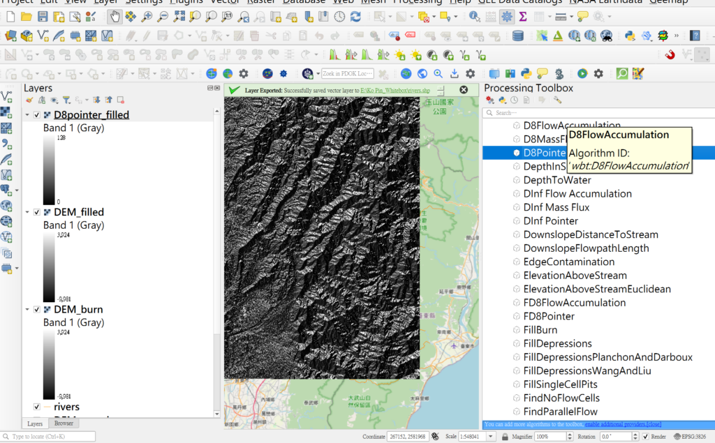 White Box重點不在河川定義,主要在Catchment定義,首先從QuickOSM中直接擷取研究地區河川,重新輸出river 同時設定座標系統,將river burn in DEM。DEM_burn 必須先填平窪地,因此接著要filled DEM,再選D8pointer就是flowdirections,再選D8flowaccumulation,由於河川已定義由OSM中擷取,只要Catchment定義即可。但Catchment必須先決定outlet,為了outlet先建立臨時scratch point,使用snappourpoint讓outlet吸附上擷取的河川,離河川愈接近愈好。在程式中Watershed可完成最終Catchment。經過Raster to Vector Polygons, catchment可成shp檔案格式。