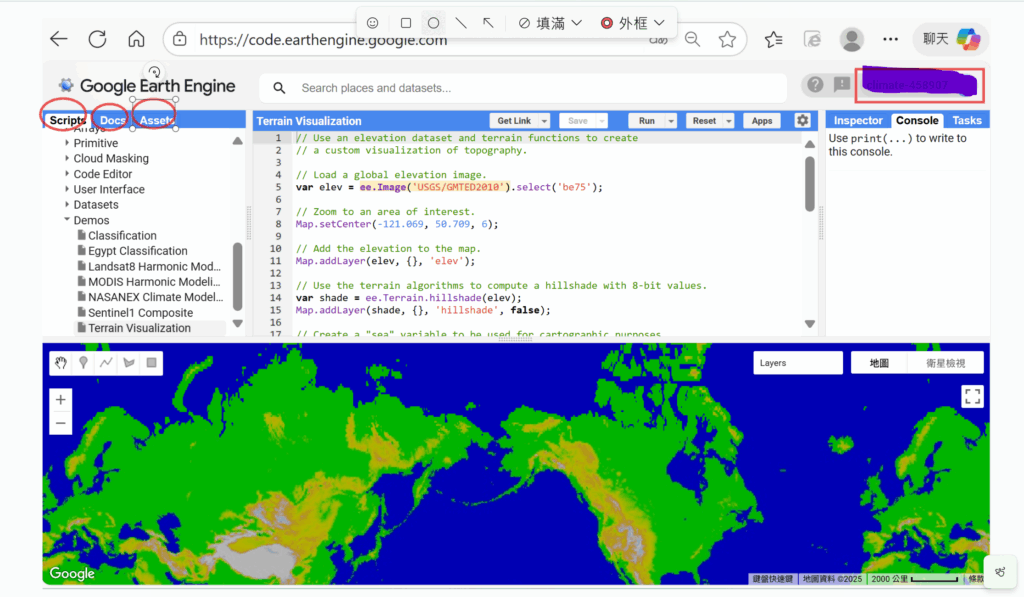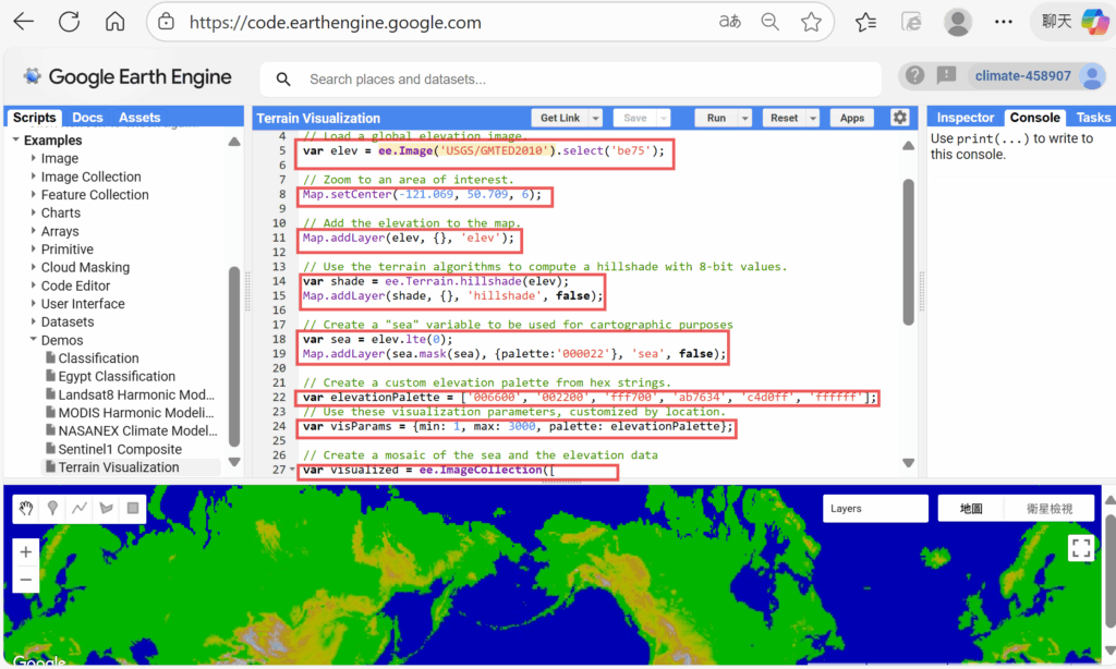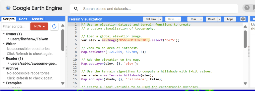 以上google earth engine是根據google擁有大量USGS的衛星影像資料,根據javascriptsm語法,排列劃出全球地形分布。