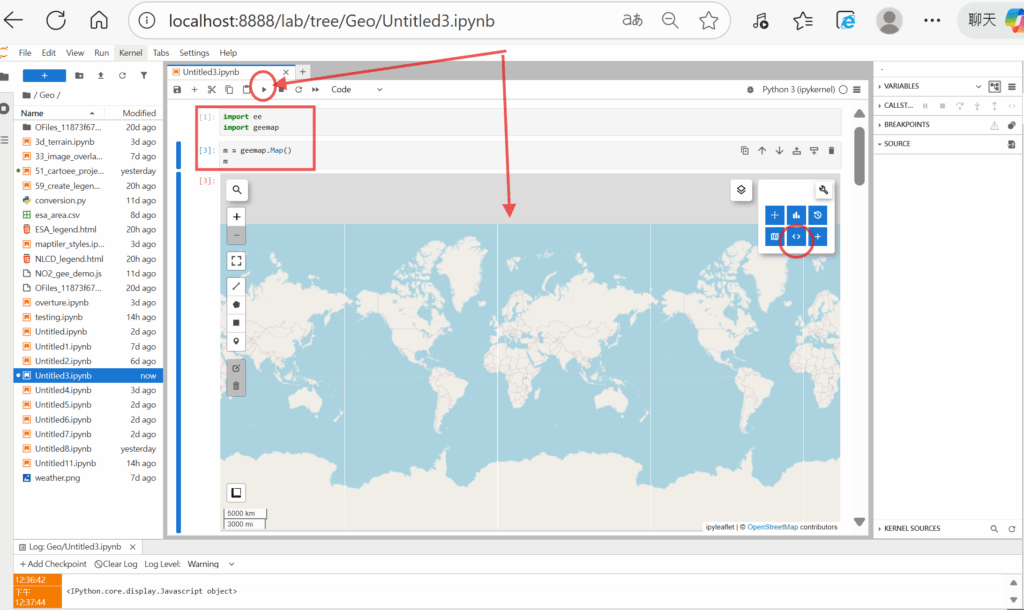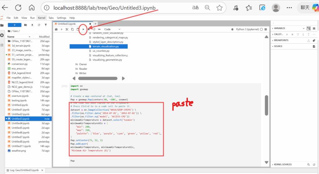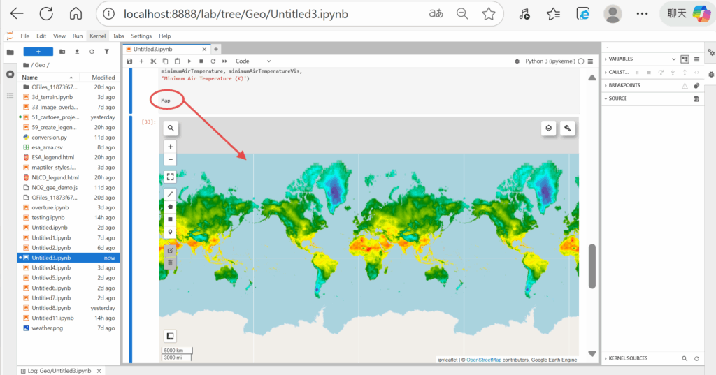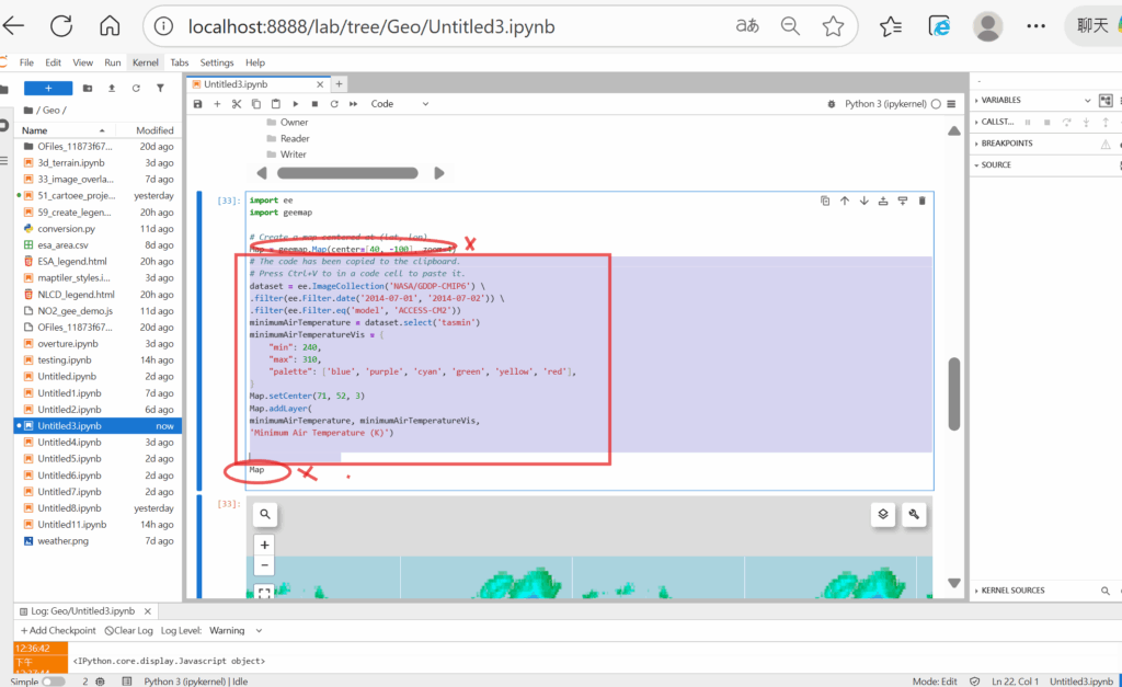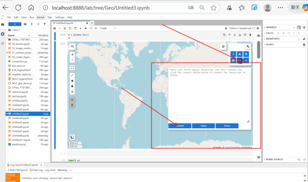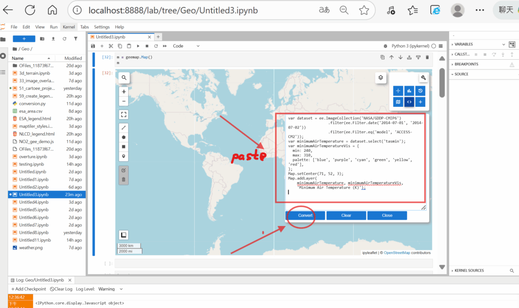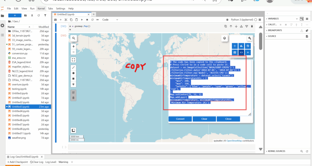 3.copy scrips貼在jupyter lab中geemap中圖示:conversion為python,再貼入下列程序中執行,即可呈現python所繪製分布圖,和google earth engine 呈現一致。