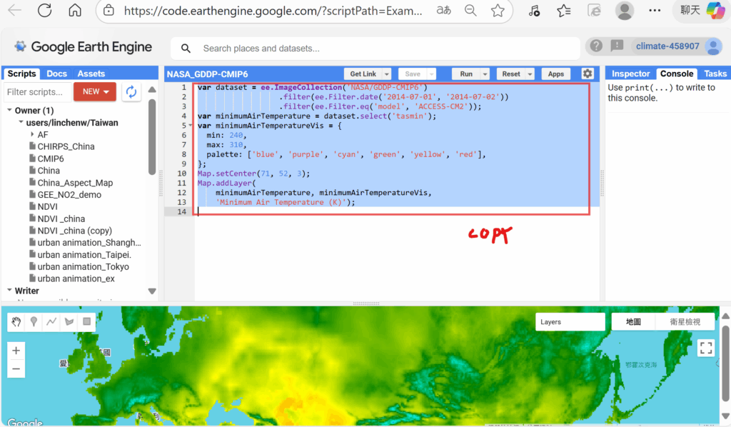 1.在google earth engine中載入climate中全球地面氣溫分布為例: