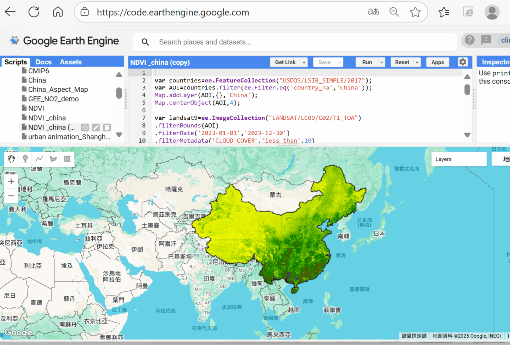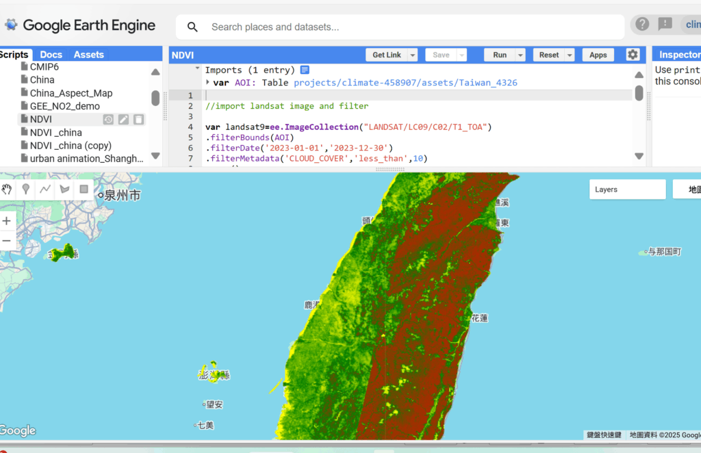Google Earth Engine因為google擁有大量衛星資料,而且面積較大,甚至全球資料,因此運算,分析能力較強,例如分析地面綠化指數,必須利用Landsat8多光段衛星影像,band4與band5光段,若是計算NDVI指數台灣僅能計算衛星繞行部分區域,以Qgis只能計算小範圍資料,但是Google Earth Engine可計算全台灣,甚至全中國NDVI分布: